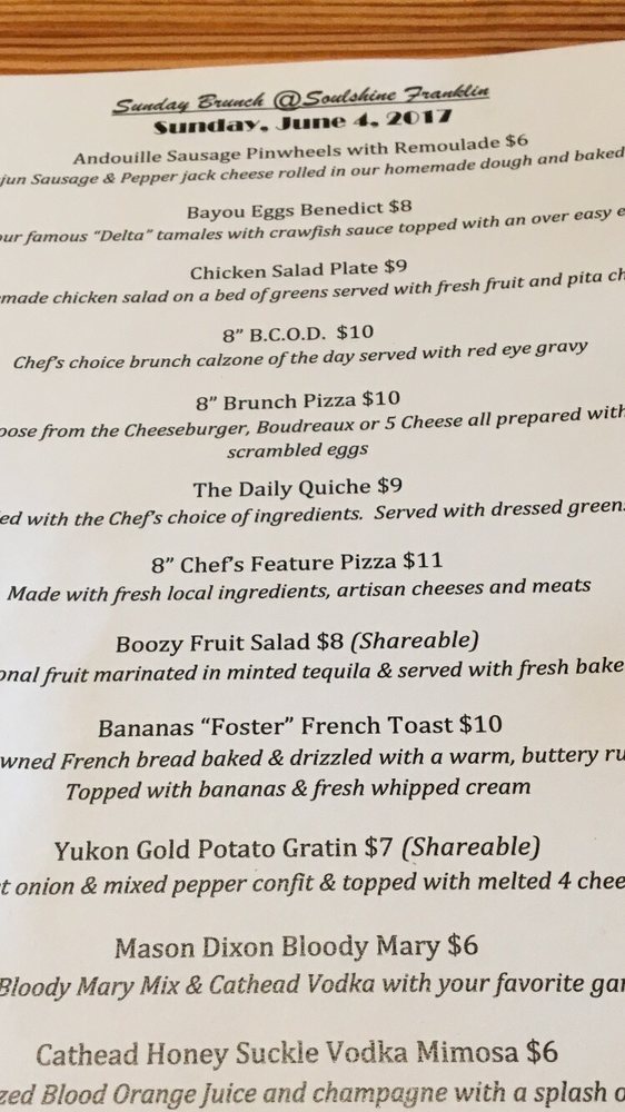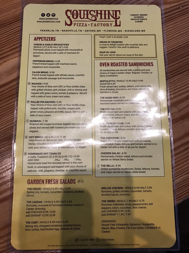 Soulshine Pizza offers a diverse menu with options for everyone, including vegan and vegetarian choices. Located in Franklin, TN, this trendy pizzeria provides delivery, takeout, and catering services. The menu features unique items such as Pepperoni Bread and Crawfish Bread, alongside classic dishes like Spaghetti & Meatballs. Customers rave about the delicious CCR pie and cream of crawfish soup, emphasizing the quality of ingredients and service. With a lively atmosphere, live music, and karaoke nights, Soulshine Pizza is a great spot for a casual meal with friends or family. Don't miss out on their lunch specials, including personal pizzas, salads, and drinks at an unbeatable price. Overall, Soulshine Pizza offers a welcoming dining experience with flavorful dishes that keep customers coming back for more.